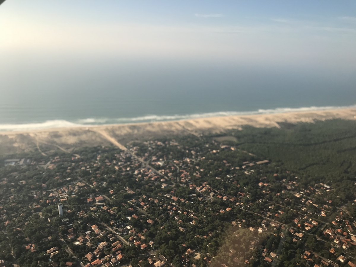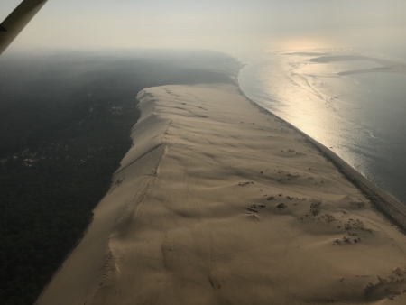 Le bassin d'Arcachon vu du ciel est un enchantement permanent qui permet de se rendre compte des immensités naturelles dont il est le coeur; la foret de pins maritimes des Landes de Gascogne et l'océan Atlantique avec pour trait d'union le sable fin et immaculé des plages et du cordon de dunes côtières.